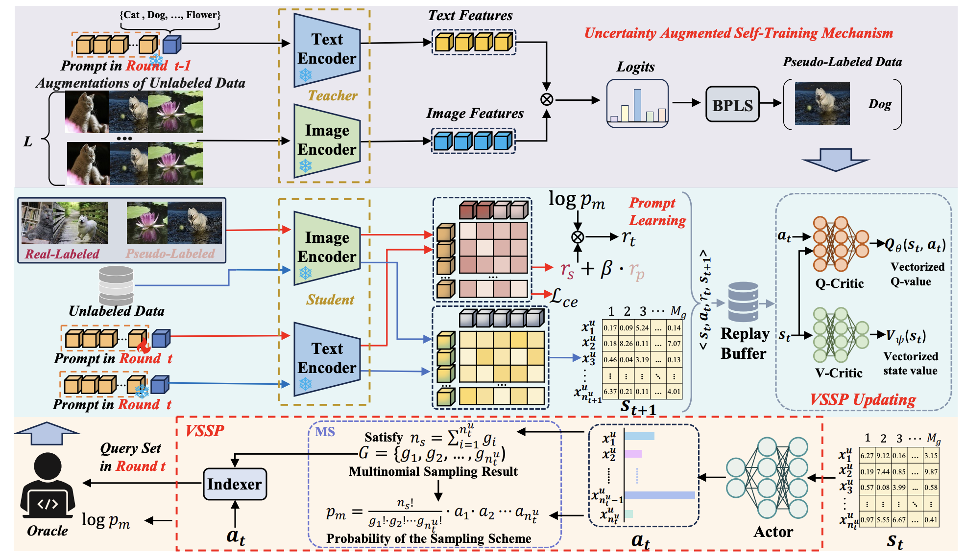 We propose a prompt-guided self-training sampling policy for active prompt learning, which improves sample selection by integrating soft actor-critic optimization with real-pseudo hybrid rewards and vectorized critics.