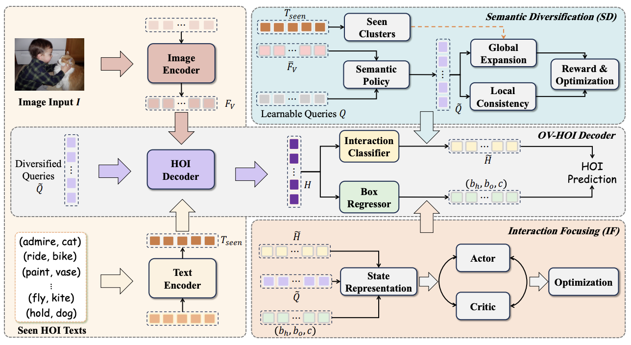 We propose a semantic-diversified and interaction-focused framework for open-vocabulary HOI detection, which enhances generalization to unseen interactions while capturing more discriminative and spatially interpretable interaction cues.